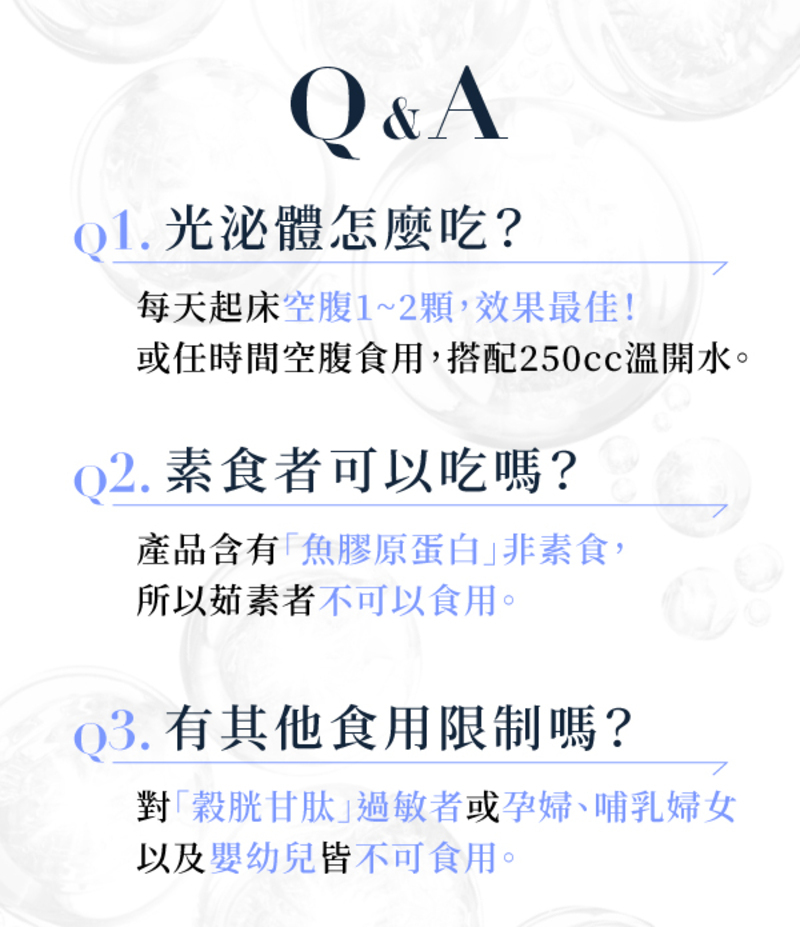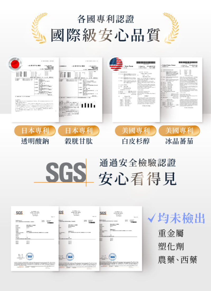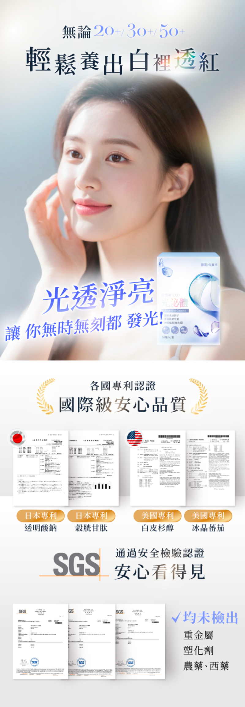 魚膠原蛋白、穀胱甘肽(圓酵母萃取)、光泌因子(黃金麥角胜肽(金頂側耳萃取物、刺芹側耳萃取物)、酵母發酵物(含SAM-e)、蕎麥苗粉(含亞精胺)、余甘子萃取物)、百香果萃取物(麥芽糊精、百香果萃取物(含白皮杉醇))、番茄萃取物(含冰晶番茄)、二氧化矽、鮭魚軟骨萃取(鮭魚軟骨萃取(含蛋白多醣)、麥芽糊精)、流行鏈球菌發酵物(含透明質酸鈉)、米萃取物(水解膠原蛋白、米萃取物(含神經醯胺))。=規格=