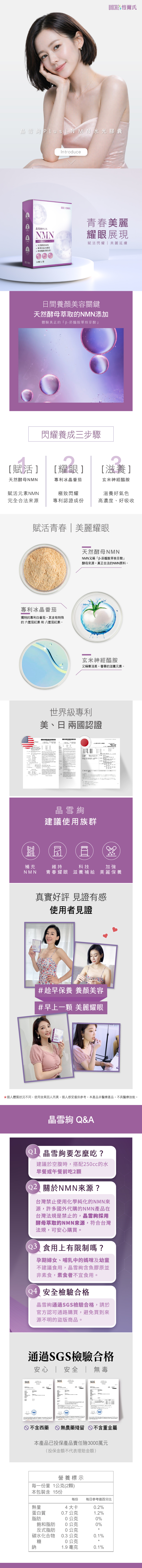 魚膠原蛋白肽、魚膠原蛋白、乳糖、余甘子萃取物(余甘子萃取物、二氧化矽)、酵母粉(含ß-菸醯胺單核苷酸(NMN))、酵母萃取(含ß-聚葡萄糖)、番茄萃取物(含冰晶番茄)、米萃取物(水解膠原蛋白、米萃取物(含神經醯胺))。=規格=
